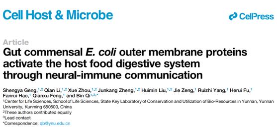 2022年9月2日,云南大学生命科学中心祁斌研究组在Cell Host & Microbe上以“Gut commensal E. coli outer membrane proteins activate the host food digestive system through neural-immune communication”为题,报道了肠道共生大肠杆菌的膜蛋白通过宿主神经-免疫来激活食物消化系统的机制。