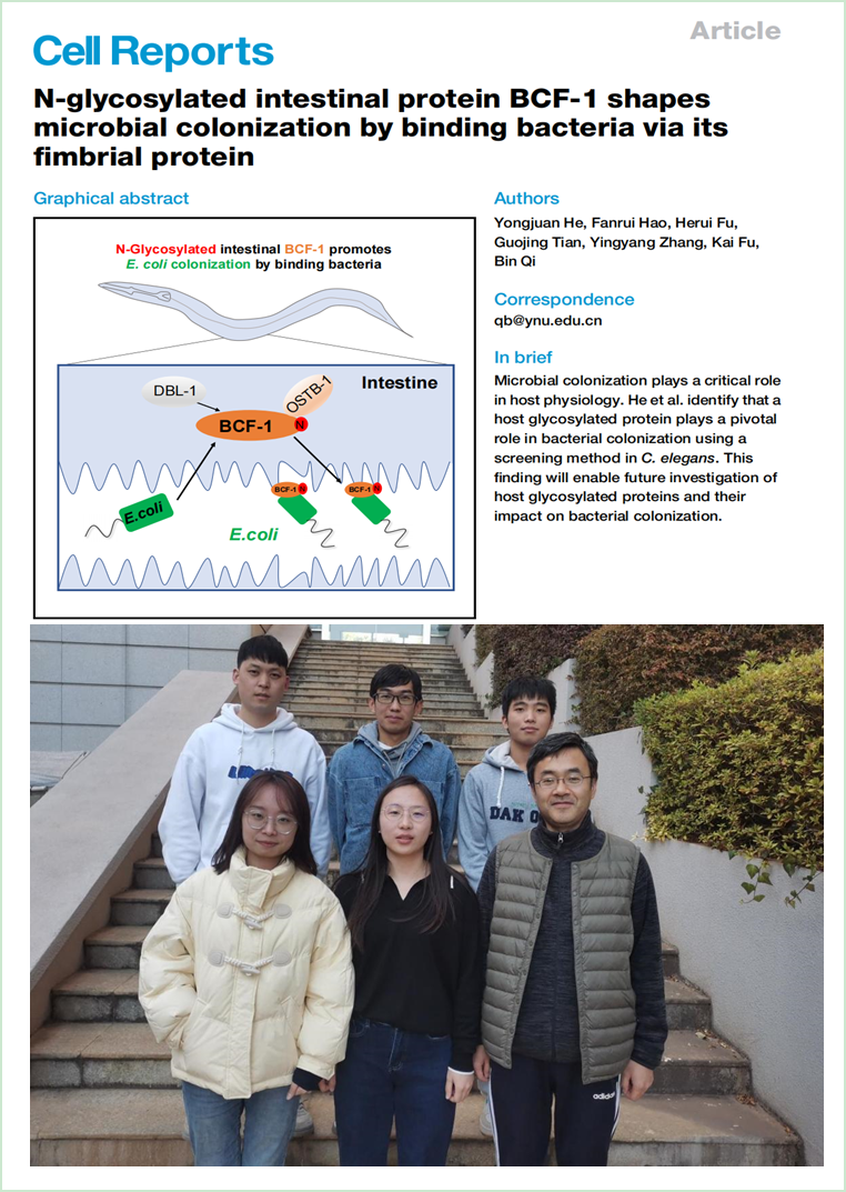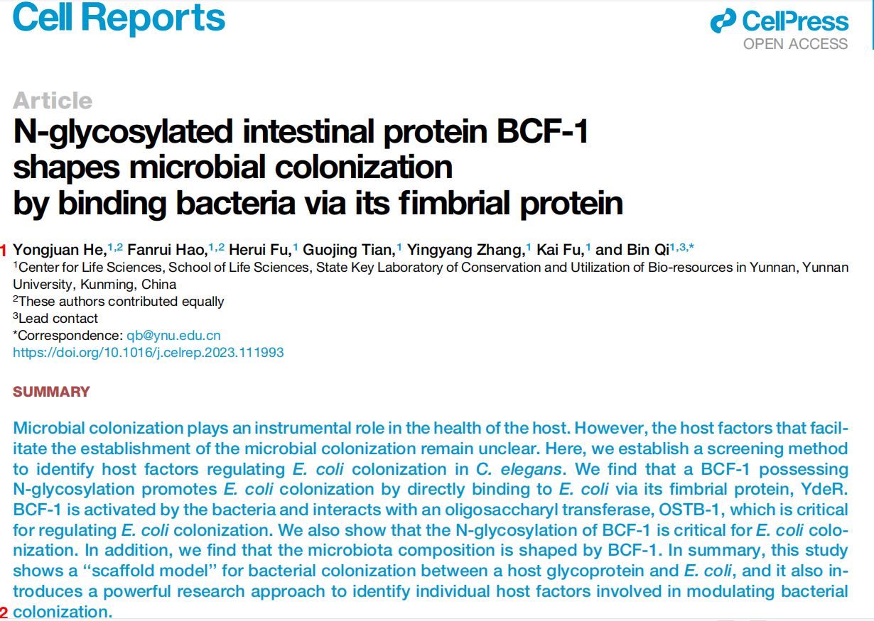 2023年1月18日,云南大学生命科学中心祁斌课题组在Cell Reports上以“N-Glycosylated Intestinal Protein BCF-1 Shapes Microbial Colonization by Binding Bacteria via its Fimbrial Protein”为题,报道了宿主N-糖基化蛋白BCF-1通过与细菌菌毛蛋白互作调控肠道菌定植的机制。